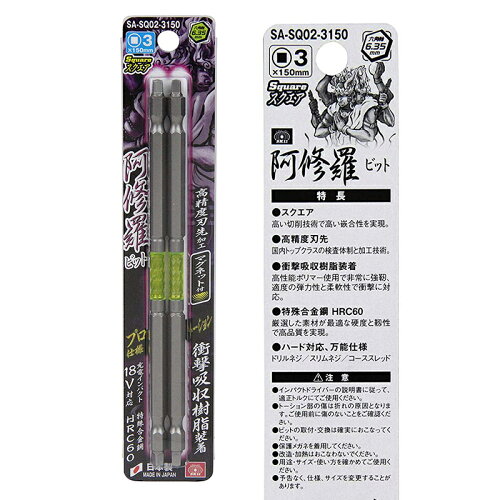 SK11 阿修羅ビット スクエア 2P SA-SQ02-3150 スクエア3×150mm マグネット付 六角軸6.35mm 2本入り メール便対応(8個まで) 4977292306911