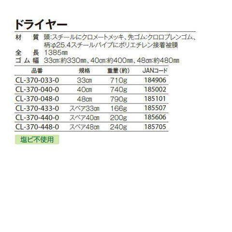 【床水切り用ブラシ】 ドライヤー(スペアー) 溜まった雨水や洗浄水処理の定番ドライヤー ■材質:頭:スチールにクロメートメッキ 先ゴム:クロロプレンゴム 柄:φ25.4スチールパイプにポリエチレン接着被膜 ■全長:1385mm ■ゴム幅:33cm:約330mm 40cm:約400mm 48cm:約480mm ■重量:約200g ■規格:スペア40cm ●塩ビ不使用 ドライヤー33cm ドライヤー40cm ドライヤー48cm ドライヤースペア33cm ドライヤースペア40cm ドライヤースペア48cm ※注意点 モニターの発色によりお色が違って見える場合がございます。